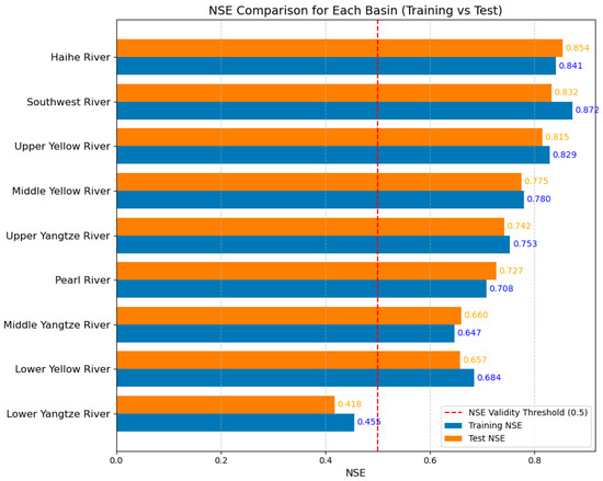 To assess the performance of the LSTM model in delineating SM dynamics, separate models were trained and tested for each of the nine basins. As shown in Figure 9, the average NSE values for most basins exceeded this threshold, except for the Lower Yangtze River Basin, where the NSE value was slightly below 0.5. This result suggested that the SM dynamics in the Lower Yangtze River Basin are less influenced by the selected hydrometeorological variables. Nonetheless, the relatively low MAE and RMSE values, combined with a test dataset NSE of 0.455, demonstrated that the model was still able to reasonably capture the effects of hydrometeorological factors on SM in this basin. For the other basins, the model exhibited strong performance, with MAE and RMSE values consistently lower, and NSE values ranging from 0.647 to 0.872 during the training phase and from 0.657 to 0.854 during the testing phase. These results confirmed the robustness of the LSTM model in simulating SM dynamics across diverse regions, capturing the complex interactions between hydrometeorological factors and SM variations effectively.