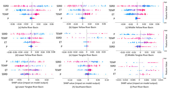 We employed SHAP values, derived from the EG method, to interpret the contribution of key features (i.e., precipitation, temperature, SSRD, and ET) to SM dynamics during defined drought events. The analysis modeled SM dynamics for six months preceding the onset of each drought event. Figure 10 presents the SHAP-based interpretability analysis for all identified drought events across the nine basins. Notably, the mean SHAP values were higher in the northern basins compared to the southern basins, indicating a stronger influence of meteorological drivers on droughts in the northern regions. In basins such as the Haihe, Upper Yellow River, Middle Yellow River, Lower Yellow River, Southwest, and Pearl River, high SSRD emerged as the dominant factor driving droughts. Additional factors, including low ET, temperature, and precipitation, also contributed to reduced SM levels, though precipitation had a minimal effect in these basins. In contrast, in the Upper Yangtze River Basin, droughts were primarily driven by low temperatures and high SSRD. The dominance of SSRD in semi-humid and semi-arid regions, (e.g., Haihe and Yellow River Basins) aligns with the limited precipitation and increased susceptibility to radiation-driven soil drying. Interestingly, the Pearl River Basin, despite its high precipitation and dense tree cover, also experiences droughts predominantly driven by SSRD. Conversely, in the Middle and Lower Yangtze River Basins, droughts were primarily attributed to low precipitation and high temperatures, with SSRD exerting minimal influence.