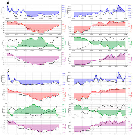 The Theil–Sen slope estimates indicated varied trends in SM changes across basins over the 43-year period. Most basins exhibited a positive trend, with the northern regions experiencing more pronounced increases. The Lower Yellow River Basin showed the most substantial increase, with a slope of 3.06 × 10⁻3 m3m⁻3/decade, followed by moderate upward trends in the Upper and Middle Yellow River Basins, the Haihe River Basin, the Upper Yangtze River Basin, and the Pearl River Bain (slopes between 1.12 × 10⁻3 and 1.70 × 10⁻3 m3m⁻3/decade). The Middle and Lower Yangtze River Basin showed minimal increases (6.61 × 10⁻4 and 5.50 × 10⁻4 m3m⁻3/decade, respectively). The Southwest River Basin was unique in showing a slight decline in SM levels, with a slope of −9.44 × 10⁻4 m3m⁻3/decade. The northern basins showed more substantial increases with an average slope of 1.97 × 10⁻3 m3m⁻3/decade, while the southern basins exhibited smaller changes with an average slope of 6.01 × 10⁻4 m3m⁻3/decade. This pattern suggests that regions with abundant precipitation, such as the south, tend to maintain stable SM conditions, while the drier northern regions show a greater potential for SM variability.