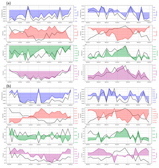 In the Middle and Lower Yangtze River Basins, the seasonal patterns of drought drivers were also evident (Figure 12). In the Middle Yangtze River Basin, two drought events (April 2011 and October 2013) were analyzed. The April 2011 drought was primarily caused by low precipitation, whereas the October 2013 drought resulted from the combined effects of low precipitation and high temperatures. Similarly, in the Lower Yangtze River Basin, the March 2011 drought was largely driven by low precipitation, while the October 2013 drought was influenced by both high temperatures and low precipitation. Unlike other basins, SM decreases in the Yangtze River region were particularly sensitive to precipitation deficits. In spring, precipitation alone was the primary driver of SM decline, while autumn droughts were influenced by a combination of precipitation and temperature. This underscores the unique climatic dynamics of the Yangtze River region, where drought drivers transition from precipitation dominance in spring to multifactor influences in autumn.