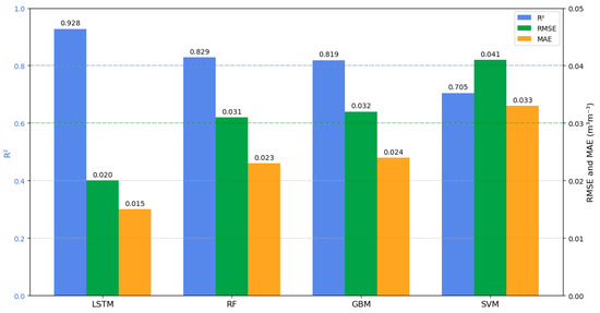 Performance comparison of our LSTM model against the traditional machine learning methods random forest (RF), gradient boosting machine (GBM), and support vector machine (SVM) for SM gap filling. The evaluation metrics R2, RMSE, and MAE show that LSTM achieves better results than all the traditional approaches tested.