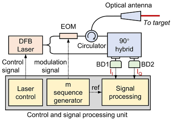 A schematic diagram of the proposed method is shown in Figure 1. The narrow-linewidth laser generated by the distributed feedback (DFB) laser is split by a fiber coupler. One beam is sent to a 90° optical hybrid as the local oscillation light. The other beam is low-depth phase modulated with a periodic pseudo-random binary sequence (PRBS) by the electro-optic modulator (EOM), simultaneously generating modulated and unmodulated optical carriers. Then, the carriers are transmitted to the target. The backscattered light of the target is coupled back to the fiber, and goes into the 90° optical hybrid as a signal light, which interferes with the local oscillation light and forms four interfering optical signals with a phase difference of 90°. They are differentially acquired by the balanced detectors to form two quadrature interference photocurrent signals II and IQ. Due to the low-depth phase modulation, the quadrature interference photocurrent signals contain modulated and unmodulated components, respectively, formed by the modulated and unmodulated optical carriers. Therefore, the DFS of the target can be parallelly derived and decoupled from the unmodulated component, and then the total delay between the local reference and the signal light can be obtained from the modulated component to accomplish ranging. On this basis, the sliding window analysis of photocurrent signals is performed, enabling further improvements of the temporal resolution of the measurement.