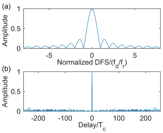 This means that the result of the matched filter can be evaluated by the ambiguity function. The normalized ambiguity function of the seventh-order m-sequence () is shown in Figure 3 (shades of colors correspond to changes in amplitudes), along with its zero-delay profile and zero-DFS profile, shown in Figure 4. The normalized DFS defined in figures is the ratio of the DFS and the repetition frequency of PRBS.