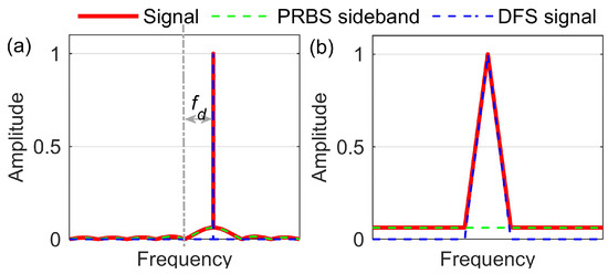In Equation (19), the first term represents the spectrum of the DFS signal. Its energy is concentrated in the bandwidth . The second term represents the frequency spectrum of the PRBS for ranging. It is similar to white noise, so its energy is approximately uniformly distributed in the bandwidth . Since the modulation depth coefficient is set at , the energy of the two terms is the same, but the amplitude spectrum of the DFS signal is more concentrated in the frequency domain. The peak of the amplitude spectrum is obviously higher than that of the PRBS signal. Therefore, the position of the peak value in Equation (19) can be clearly located by spectrum analysis.