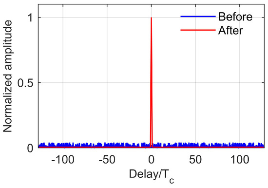 The output of the matched filter before and after frequency shifting of the complex photocurrent signal is shown in Figure 6 (settings are the same as Figure 5). It can be seen that the correlator has no peak before the Doppler effect compensation, while an obvious peak can be found after compensation.
