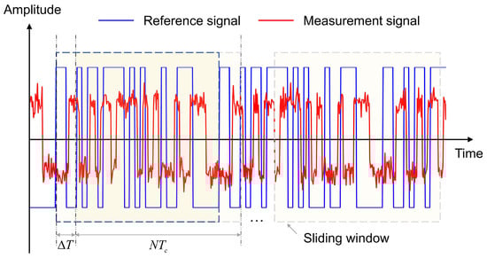 This means that the ranging is complete at the beginning of the measurement time window. We select the code repeating period (shown as the dotted box) as the signal analysis length and as the sliding window interval, as shown in Figure 8; then, the temporal ranging resolution can be enhanced to , and up to the sample rate.