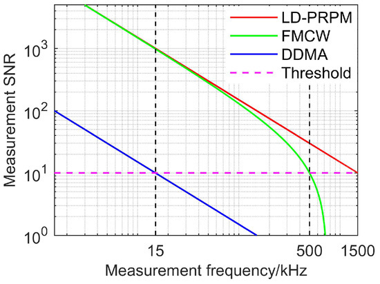 Assuming that (1) the above-mentioned echo signal power is obtained with a target located at a 100 m distance, and (2) when the LD-PRPM method detects at the maximum measurement frequency (1.5 MHz) without generating measurement ambiguity, the detection threshold of 10 dB SNR will be reached. A plot of the measurement SNR varying with the measurement frequencies of each laser ranging method can be made, as shown in Figure 9.