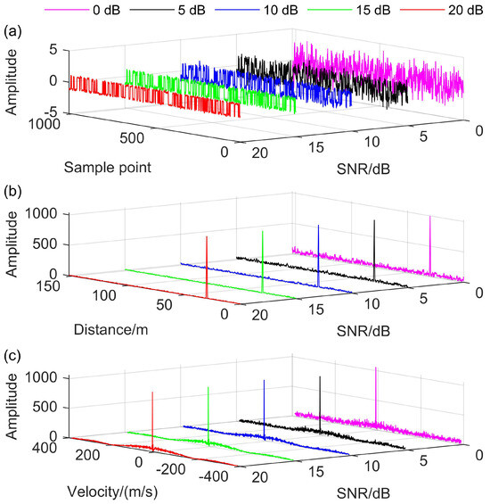 In the first set of measurements, the target was located at a constant position (30 m) and had a constant velocity (10 m/s). The simulation results are shown in Figure 10. It shows the time-domain waveforms of the modulated components of the complex photocurrent signals, the ranging spectrum (mapped by matched filter output) and the velocity spectrum (corresponding to the decoupled DFS, mapped by a FFT amplitude spectrum) of the target under different SNRs. It can be seen that the position and velocity spectrum in Figure 10b,c were consistent with the theoretical analysis. Moreover, even if the signal was overwhelmed by noise in the low SNR case, the proposed method was still effective in achieving detection.