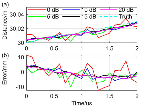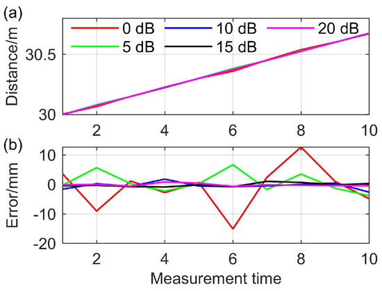 In the second set of measurements, the target was moved at a constant velocity (10 m/s), but was located at different positions (30–30.675 m, with a 0.075 m interval). The correlation peak was located by the fourth-order polynomial method [7] and the spectrum peak was located by zero-filling FFT (100-fold subdivision). The simulation results are shown in Figure 11. The peak-to-peak value of the measurement error was about ±10 mm at 0 dB SNR, and ±1 mm at 20 dB SNR.