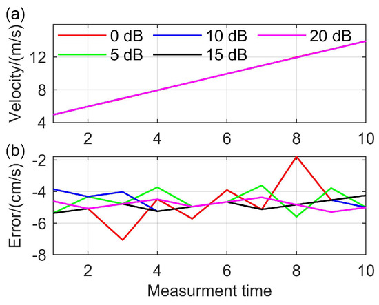 In the third set of measurements, the target was located at constant position (30 m), but had different velocities (5–14 m/s, with a 1 m/s interval). The correlation peak was located by fourth-order polynomial, and the spectrum peak was located by zero-filling FFT (100-fold subdivision). The simulation results are shown in Figure 12. The peak-to-peak value of the measurement error was about ±2.5 cm/s at 0 dB SNR, and ±0.25 cm/s at 20 dB SNR.