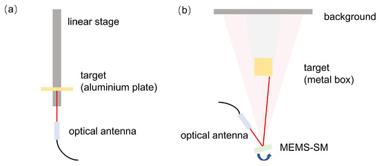 Based on the setup shown in Figure 14a, coherent detection with LD-PRPM was verified, and the measurement accuracy and precision of the ranging system were evaluated. The measurement beam was coaxially transmitted and received by an optical antenna, and the measurement target was an aluminum plate mounted on a high-precision linear stage, with a nominal positioning accuracy of 0.05 mm and a maximum velocity of 0.4 m/s. Based on the setup shown in Figure 14b, the rapid ranging capability of the sliding window measurement was verified, demonstrating the application feasibility for high-resolution/high-frame rate LiDAR. The measurement beam was coaxially transmitted and received by an optical antenna and scanned by a MEMS-SM. A metal box served as the measurement target and the white wall acted as the background.