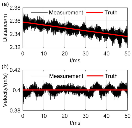 Firstly, the target moved at maximum velocity of 0.4 m/s, leading to a DFS of about 500 kHz. An m-sequence with a phase modulation depth coefficient of , code rate of 204.7 MHz, and total length of 2047 was used as the modulation signal. At this time, the integration time of the measurement was 10 μs, corresponding to a spectral resolution of 100 kHz. A total of 50 ms of data were collected by the oscilloscope with a sample rate of 1 GHz, and obtained 5000 measurement points, as shown with the black line in Figure 15. The red line was the truth value, derived from the linear stage controller. It can be seen that the ranging system accurately measured the 20 mm target displacement in 50 ms, and determined the target velocity to be 0.4 m/s with the calculated DFS.