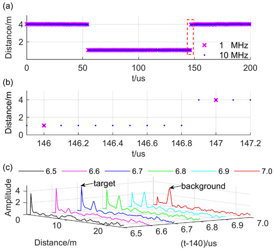 It can be seen that the ranging system clearly recognized the target at 1 m and the white wall background at 4 m regardless of whether the time window was slid or not. The partial enlarged view of the red dashed box in Figure 16a is shown in Figure 16b. Due to the limitations of the temporal resolution, the 1 MHz ranging rate results localized the target edge at 146 μs, while the 10 MHz ranging rate results more accurately located the edge at 146.8 μs. The entire process of the measurement beam moving from the target to the background white wall from 146.5 μs to 147 μs was recorded in Figure 16c. It can be seen that the light spot had been partially incident to the white wall background at 146.6 μs, which means that we can use more complex signal processing methods to achieve more accurate edge localization. This rapid ranging capability is critical for high-resolution/high-frame rate LiDAR.