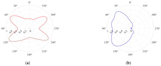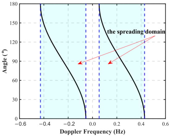 Given the space-constrained shipborne platform, a single antenna is optimal for both transmission and reception, which is the antenna configuration considered in this article. Ideally, the receiving antenna functions as a directional sensor with a single-side-looking characteristic (), as shown in Figure 2. As a result, the first-order Bragg peaks of shipborne HFSWR are spreading, represented by the blue-shaded region in Figure 1, with the spreading domains expressed as