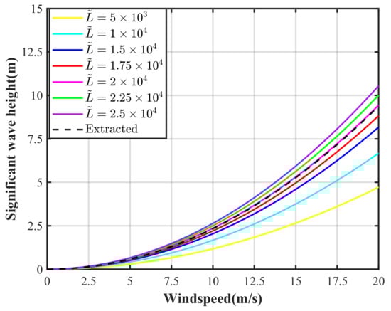Figure 4 presents extracted significant wave heights, along with actual significant wave heights for various values of as a function of wind speed. When , the extracted and actual values are in full agreement. However, deviations in —whether too high or too low—introduce errors in significant wave heights extracted from Equation (16). To establish criteria for approximation feasibility, the upper limit of relative error, , is defined based on specific experimental accuracy requirements. Here, is set to 20%, serving as a reasonable acceptable threshold. For developing wind seas, the approximation replacement requires to fall within (1.37–3.05) × to ensure .