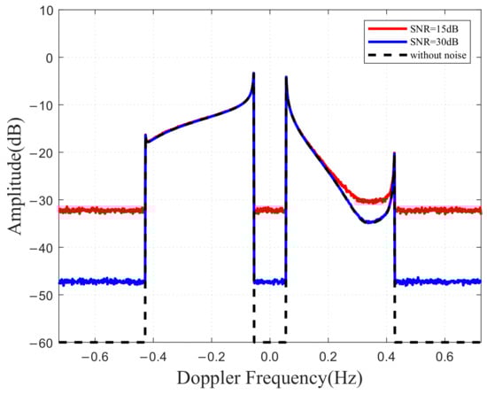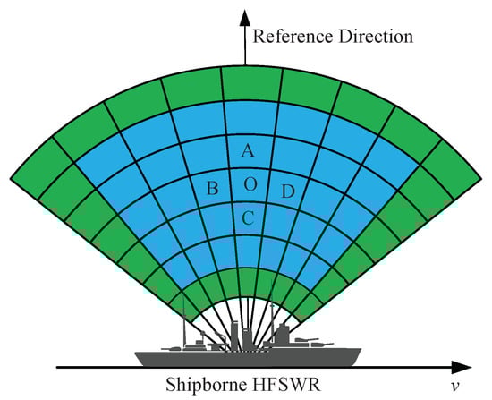 Therefore, sea cells at different azimuths introduce varying frequency shifts to the first-order Bragg peaks with onshore HFSWR, as demonstrated in Figure 1, which operates at a frequency of 5.6 MHz, with a shipborne speed of 5 m/s.