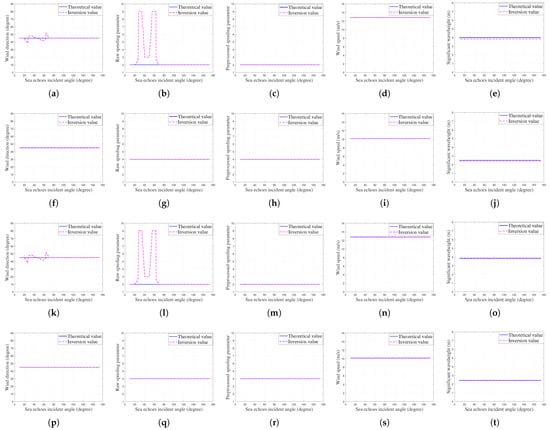 Wind and wave field extraction results: (a–e) Condition 1. (f–j) Condition 3. (k–o) Condition 5. (p–t) Condition 7.