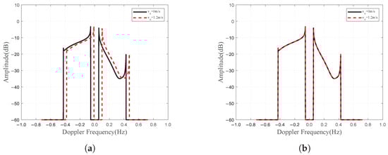 To address this issue, integrated compensation is applied to mitigate the influence of a uniform radial current by observing the boundaries of the affected first-order Bragg peaks and shifting them to the ideal positions described in Equation (4). Results before and after compensation, shown in Figure 10a,b for wind-sea condition 1, confirm the effectiveness of the compensation as the first-order Bragg peaks are restored to their ideal state. Therefore, after applying the integrated compensation, the radial ocean current has little to no effect on the significant wave height extraction.