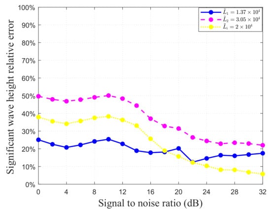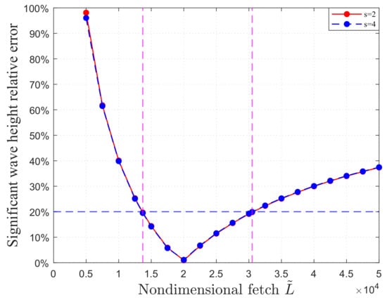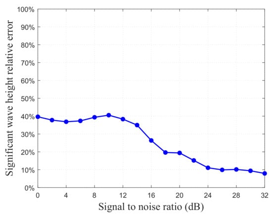 Equation (27) consistently satisfies , reflecting the tolerance of the significant wave height extraction process to the input errors, as illustrated in Figure 5 with a radiation frequency of 5.6 MHz as an example. However, if the inverted spreading parameter is an outlier, its relative error increases significantly, and, although the relative error in the significant wave height is reduced compared to the input, it may remain unacceptably high. Thus, controlling the occurrence of spreading parameter outliers is essential.