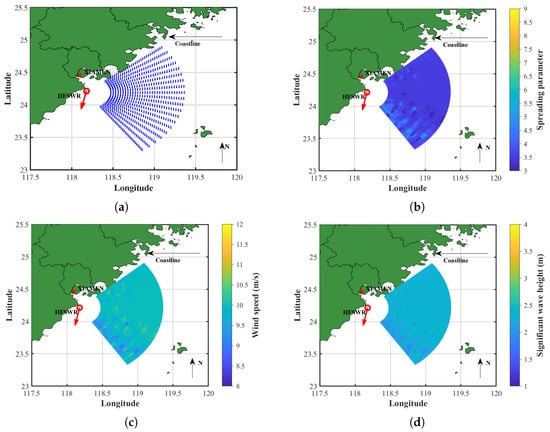 The extracted wind and wave field information maps of Experiment 2: (a) wind direction; (b) spreading parameter; (c) wind speed; (d) significant wave height.