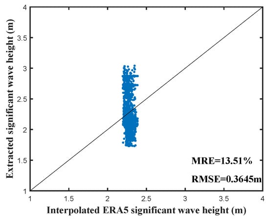 In Experiment 2, all the data groups yield a total of 2546 significant wave height samples. Figure 22 presents the histograms of the interpolated ERA5 and extracted significant wave heights. All the ERA5 reference data fall within the range of 2.1 to 2.4 m, represented by the red dashed lines in Figure 22, while the extracted significant wave heights are more dispersed, with approximately 31.81% within this range. The range of significant wave heights within a 20% error limit spans from about 1.6 to 2.9 m, as indicated by the green dashed lines in Figure 22, with approximately 98.82% of the extracted significant wave heights lying within this range, indicating that most of the results are close to the actual values. The scatterplots in Figure 23 further illustrate this dispersion, with the MRE and RMSE between the ERA5 and extracted values being 13.51% and 0.3645 m, respectively. Notably, the scatter points in Figure 19 and Figure 23 exhibit an approximately vertical distribution. This phenomenon is attributed to the fact that, over a short period, the actual significant wave heights within the detection area remain relatively stable and concentrated, whereas the extraction results exhibit a certain degree of fluctuation.