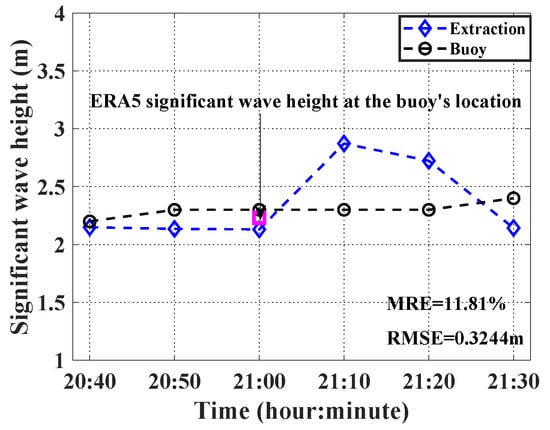 In addition, the significant wave heights extracted from shipborne HFSWR data after averaging represent the values at the midpoint of each interval. For example, the significant wave heights extracted from the first data group (20:35–20:45) are assigned to 20:40. Figure 24 compares the extracted significant wave heights at the buoy’s nearest location with buoy measurements during the experiment, yielding an MRE of 11.81% and an RMSE of 0.3244 m. Through interpolation, the ERA5 significant wave height at the buoy’s location at 21:00 is 2.2307 m, indicating strong agreement between the two datasets. This demonstrates the accuracy of the model-driven ERA5 data, which can thus accurately reflect real-time conditions.