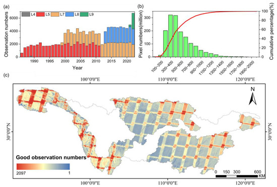 Landsat imagery of the study regions utilized in this research: (a) the annual count of Landsat images employed; (b) the distribution of good observations with green bars representing the number of pixels and the red curve depicting the cumulative percentages; (c) the spatial distribution of the number of good observation pixels.