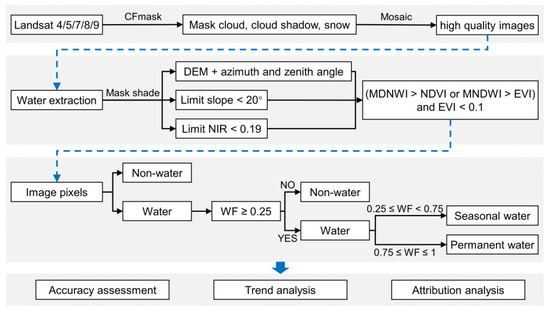 where,, , and represent blue, green, red, NIR and SWIR1 bands in Landsat images, respectively. When the pixel value meets the following criteria: (MNDWI > NDVI or MNDWI > EVI) and (EVI < 0.1, NIR < 0.19, Slope < 20°), the pixel is identified as a water pixel; otherwise, it is identified as a non-water pixel.