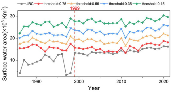 where WF is the frequency of water pixel. N represents the number of good observations of the pixel in a year. w is used to divide pixels into water and non-water categories. w = 1 is defined as water pixel, and w = 0 is defined as non-water pixel. By comparing our water dataset with the JRC dataset under different water frequency thresholds (Figure 4), it is found that when WF is not less than 0.75, the water area exhibits a good consistency with those provided by JRC after 1999. The substantial differences observed before 1999 can be explained by the prevalence of incomplete data in the JRC dataset during this earlier period, a conclusion corroborated by previous research [13,27,28,29]. Pixels are classified as water pixels if they are covered by water for at least 25% of the year. When the pixel remains inundated for at least 75% of annual period, it will be identified as a permanent water pixel. Pixels exhibiting water coverage between 25% and 75% of annual period will be classified as seasonal water pixels.