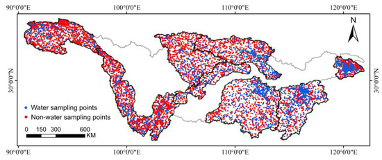Through confusion matrix analysis, we assessed the accuracy of the applied water extraction methods. Specifically, in the process of accuracy verification, we randomly generated about 9000 random sample points (Figure 5). In high-resolution images on Google Earth Pro platform, the random sample points were divided into two categories: water body and non-water body through visual interpretation. Temporal consistency was ensured by selecting high-resolution reference images that were contemporaneous with the generated open surface water map. We calculated the accuracy of open surface water maps in 1990, 2000, 2010 and 2020 (Table 1). The overall accuracy of these years is higher than 96.0%, and all Kappa coefficients are greater than 0.90.