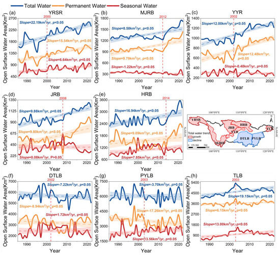 From a temporal perspective, the total water area in both YRSR and the four primarily river-dominated regions, including the MJRB (Figure 6b), the YYR (Figure 6c), the JRB (Figure 6d) and the HRB (Figure 6e), exhibited a significant increase (p < 0.05) during 1986–2022. Among them, the YRSR demonstrated the most significant increase in total water area (Figure 6a), with a 49.43% expansion and an average growth of 22.19 km2/yr. Considering absolute increase, the HRB experienced the most significant growth, with an expansion of 924.82 km2. The change in permanent and seasonal water area also varied among these regions. Specifically, both the permanent and seasonal water area in YRSR exhibited significant growth, with the latter experiencing an 84.39% increase. The permanent water area of the MJRB, YYR, JRB and HRB increased significantly in 2012, 2002, 2008 and 2014, respectively, with a growth rate of 50–80%, while the seasonal water area exhibited a decline of 10–30%.