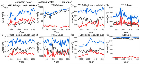 Spatial heterogeneity exists in the relative proportions of lakes and rivers across the typical regions of the YZRB results in diverse trends of water area change. The HRB, the JRB, the YYR and the MJRB are dominated by the change in the river. In river-dominated regions other than the MJRB (where the river comprises 68.23% of the water area), the river accounts for more than 90% of the area. Hence, the dominant trend of water area changes in these regions is driven by the significant increase in rivers, despite relatively stable fluctuations in lakes. In the YRSR, the proportion of lakes and rivers is 45.8% and 54.2%, respectively. Lakes are dominated by permanent water (accounting for 63.60% of all permanent water), and rivers are dominated by seasonal water (accounting for 86.24% of all seasonal water). Specifically, during 1986–2022 in the YRSR, both river and lake area have experienced significant growth, with an increase rate of 70.01% and 30.49%, respectively (Figure 7a,b). Seasonal water has been the main contributor to the growth of rivers in the YRSR, which have expanded by 124.72%, while the growth of lakes is primarily driven by permanent water, with an increase of 38.91%.