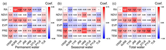 PLSR weights of factors in each typical region in YZRB: (a) PLSR weight coefficients for permanent water area. (b) PLSR weight coefficients for seasonal water area. (c) PLSR weight coefficients for total water area. Specifically, the impact of RA in DTLB and PYLB refers to the influence of the Three Gorges Reservoir, whereas in other regions, the impact of RA represents the effects of intra-basin reservoirs. Symbol “*” and “**” indicate that the PLSR weight coefficient is statistically significant with p < 0.05 and p < 0.01, respectively.