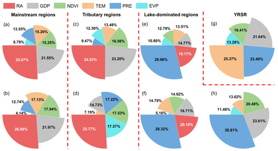 Contribution rates of factors of permanent water area in each typical region in YZRB. (a–h) represent the contribution rates in the main stream of Jinsha River Basin (MJRB), Yibin-Yichang region (YYR), Jialing River Basin (JRB), Hanjiang River Basin (HRB), Dongting Lake Basin (DTLB), Poyang Lake Basin (PYLB), the Yangtze River source region (YRSR) and Tai Lake Basin (TLB), respectively. Specifically, the impact of RA in DTLB and PYLB refer to the influence of the Three Gorges Reservoir, whereas in other regions, the impact of RA represents the effects of intra-basin reservoirs.