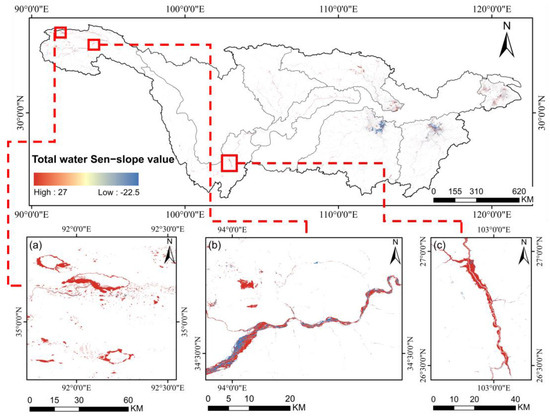 Examples of open surface water change in source region of YZRB and typical river-dominated regions. The closer a data point is to the red end of the colorbar, the greater the growth trend for the corresponding water pixel; conversely, the closer it is to the blue end, the greater the decline trend for the corresponding water pixel. (a) Cuodarima Lake, Yelusu Lake and Telashi Lake within the Yangtze River source region; (b) Tongtian River within the Yangtze River source region; (c) Baihetan Reservoir within the main stream of Jinsha River Basin.