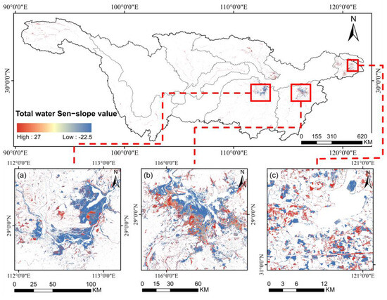 Examples of open surface water changes in typical lake-dominated regions. The closer a data point is to the red end of the colorbar, the greater the growth trend for the corresponding water pixel; conversely, the closer it is to the blue end, the greater the decline trend for the corresponding water pixel. (a) Dongting Lake; (b) Poyang Lake; (c) surrounding regions of Tai Lake.
