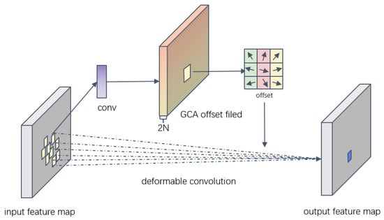The offset constraint utilizes CA [34], which has fewer parameters, as the basic attention mechanism. A global spatial information encoding branch is then incorporated to simulate the spatial relationships between pixels in the feature map, resulting in the creation of GCA. Introducing GCA to optimize the deformable convolutional offset regression module (GDCN) helps the learning of the deformable convolutional offset, enhances the feature extraction ability of the network, and improves the detection performance of the model.