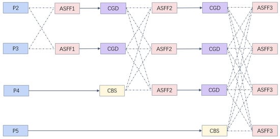 The SFPF structure is shown in Figure 3, where it can be seen that 1 × 1 convolution and bilinear interpolation are used for feature upsampling. Downsampling is based on different convolution kernels and strides. CBS (Convolution-BatchNorm-SiLU) represents traditional convolution, and CGD represents the transition layer using the Ghost-D. The specific details of the CGD are shown in Figure 4. The shallow stage P2 focuses more on information about small targets, so the feature information extracted by P2 will be integrated into the feature maps of the subsequent four detection heads. Conversely, the P5 layer that focuses on large targets does not need too much attention. A progressive structure is adopted to gradually fuse the deep network from the shallow network. In this way, the large semantic gap between non-adjacent levels can be avoided.