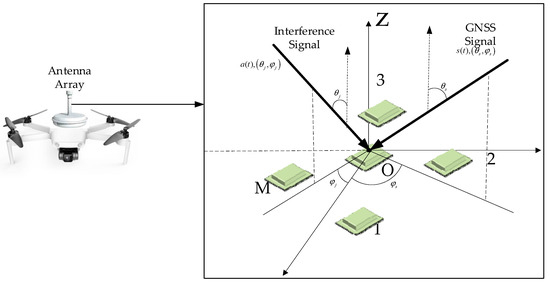 The antenna array is considered as comprising M ideal omnidirectional elements, ignoring the mutual coupling effects between elements [24,25]. Moreover, the antenna unit and radio frequency (RF) channel also meet the amplitude and phase consistency. Since the distance from the satellite signal to the ground is far greater than the array element spacing of the antenna array, it can be assumed that both the satellite signal and the interference signal are incident with plane waves. Therefore, the signal delay is only caused by the difference in the distance between the array elements.