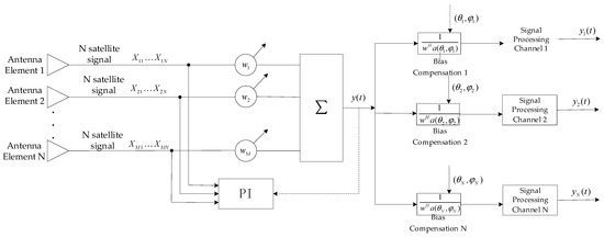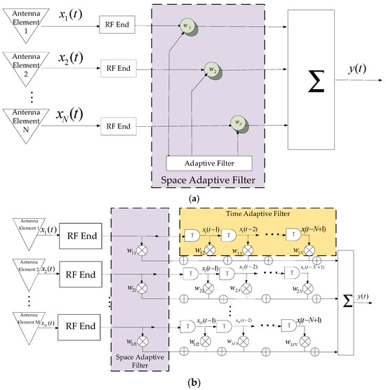 Here, is the antenna element weighting coefficient. is the array antenna receiving signal after RF front-end processing [26,27].