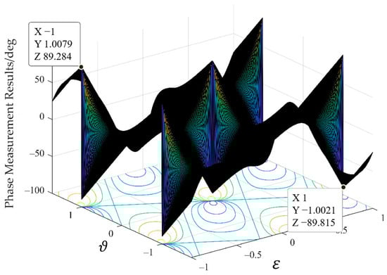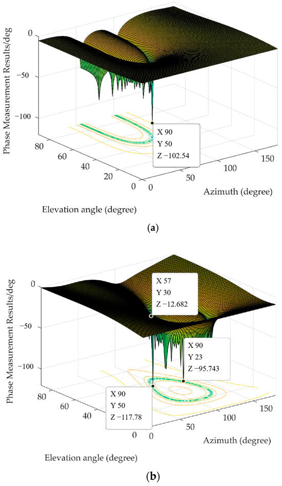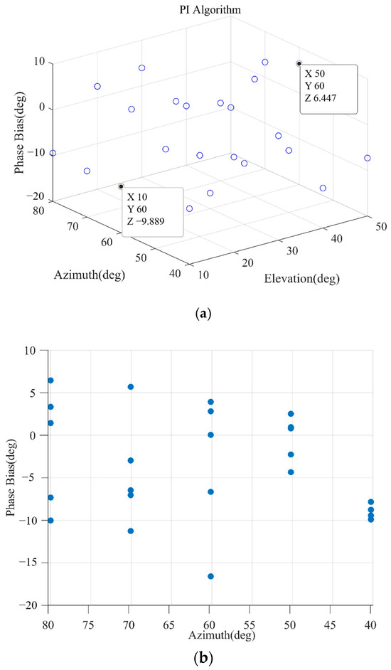 In the SAP PI algorithm, the phase biases of three-dimension distribution and two-dimension distribution are shown in Figure 7a,b. The phase bias ranges from to . When the direction of the interference signal is the same as the satellite signal, the phase bias is .