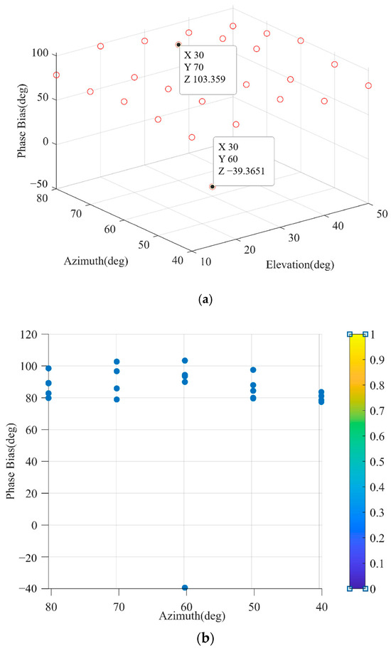 In the STAP PI algorithm, the phase biases of three-dimension distribution and two-dimension distribution are shown in Figure 8a,b. The phase bias ranges from to . When the direction of the interference signal is the same as the satellite signal, the phase bias is .