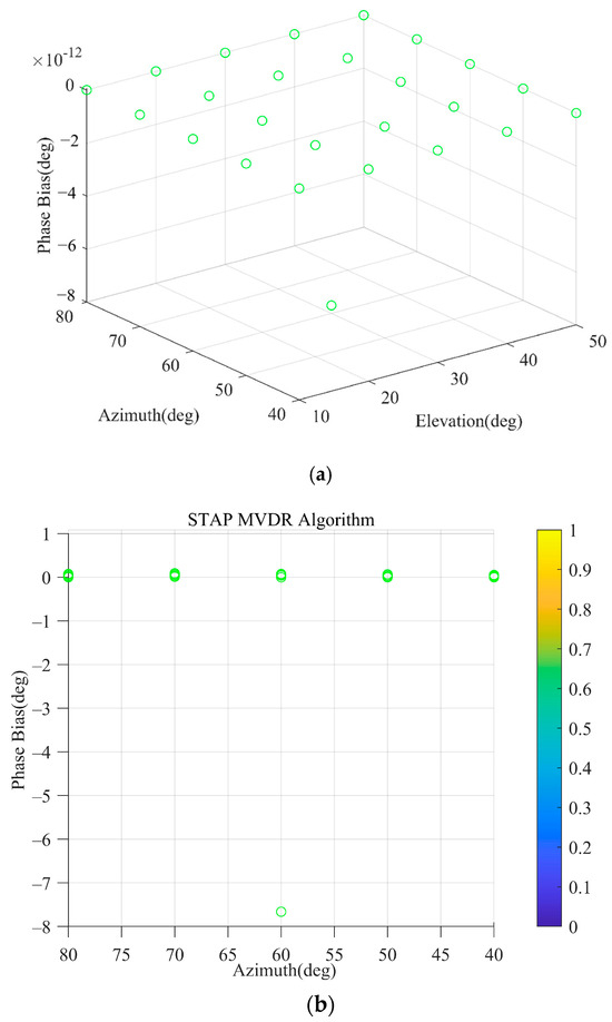 In the STAP MVDR algorithm, the phase biases of three-dimension distribution and two-dimension distribution are shown in Figure 9a,b. Based on the analysis of Section 2.5.1, the MVDR criterion will not introduce phase bias. Therefore, the phase bias in Figure 9 is .
