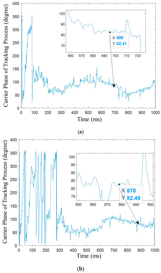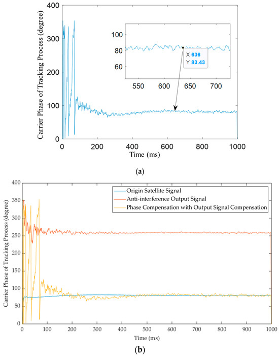 The carrier phase tracking results for antenna array. (a) The original phase of satellite signal. (b) The carrier phase after anti-interference algorithm processing.
