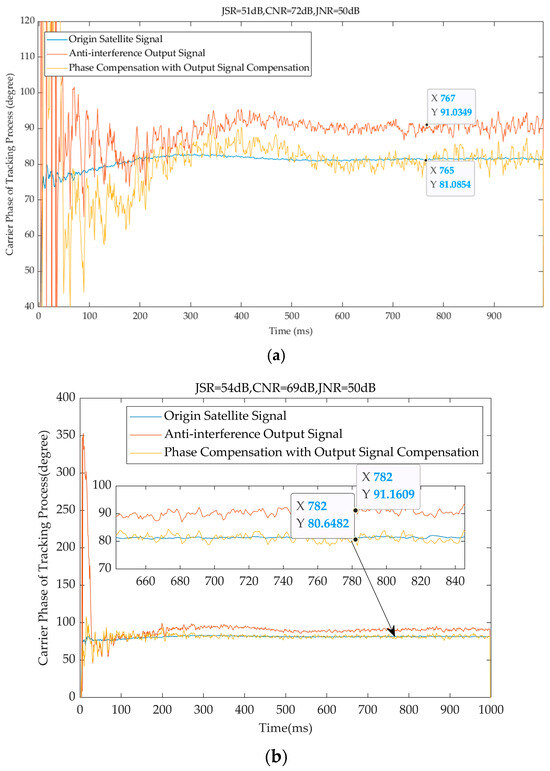 As shown in Figure 14a, with a JSR of 51 dB and a carrier-to-noise ratio (CNR) of 72 dB, the carrier phase of the original satellite signal is around 82°, while the carrier phase of the output signal after anti-interference is approximately 91°, introducing a deviation of about 9°. After applying the compensation algorithm, the mean phase bias is reduced to 0.23°, and the variance phase bias is 2.77°.