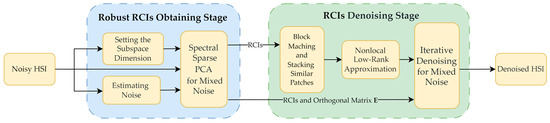 In order to optimize RCIs, it is necessary to analyze why RCIs can inherit the spatial structure of the clean HSI. Recently, study [32] reanalyzed the subspace representation process of HSI from the perspective of principal component analysis (PCA) and explained that each RCI is actually a combination of the bands of the clean HSI. However, PCA is affected by the noise-corrupted bands when estimating RCIs, which results in RCIs not being able to inherit the spatial structure of clean HSI well. To alleviate this problem, ref. [32] developed an elastic net model based on sparse principal component analysis (SPCA) to estimate RCIs and proposed a novel HSI denoising method. However, the method proposed in [32] does not demonstrate satisfactory performance in the task of HSI mixed denoising. This is because, on the one hand, the method constructs RCIs by only considering Gaussian noise conditions, without adequately accounting for the effects of other types of noise and interference. On the other hand, the method lacks an iterative strategy for removing mixed noise.