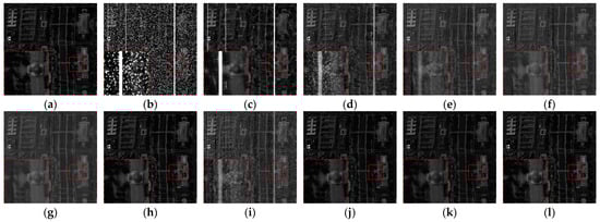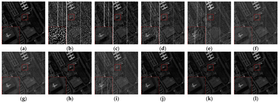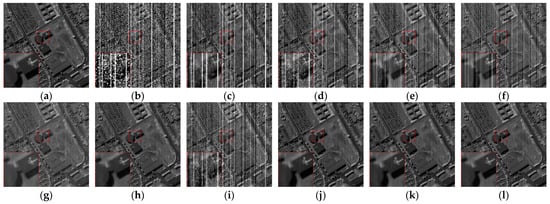 Denoised images using different methods on the band 88 of the PaU dataset in Case 4. (a) Original, (b) noisy, (c) BM4D, (d) LRMR, (e) NGMeet, (f) FastHyDe, (g) GLF, (h) SNLRSF, (i) NS3R, (j) HyWTNN, (k) DTSVD, (l) RRGNLA.