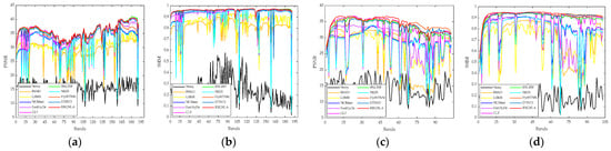 PSNR and SSIM values of each band for the WDC and the PaU datasets. (a,b) The WDC dataset in Case 3. (c,d) The PaU dataset in Case 4.