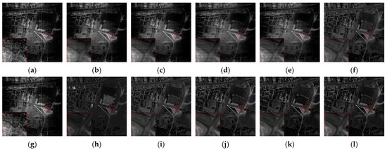 Denoised images using different methods on the band 17 of the PaU dataset in Case 3. (a) Original, (b) noisy, (c) BM4D, (d) LRMR, (e) NGMeet, (f) FastHyDe, (g) GLF, (h) SNLRSF, (i) NS3R, (j) HyWTNN, (k) DTSVD, (l) RRGNLA.
