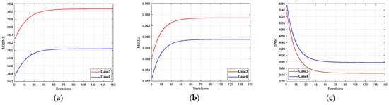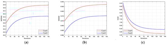 Additionally, to validate the convergence of the proposed RRGNLA method, we provide the convergence curves for different metrics on the WDC and PaU datasets in Case 3 and Case 4, as illustrated in Figure 13 and Figure 14, respectively. As the number of iterations increases, the changes in the values of MPSNR, MSSIM, and SAM tend to approach zero. This clearly demonstrates the convergence of the proposed RRGNLA method.